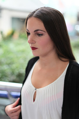 Depois, e tendo em conta o outfit seleccionado, super fashion e trendy, a maquilhagem foi refeita e, a acompanhar uma boca cor de vinho, num tom encarnado escuro e mate - bâton MAKE UP FOR EVER Rouge Artist Intense 46, os olhos estavam maquilhados de forma bastante discreta, com tons rosados e risco eyeliner a finalizar.