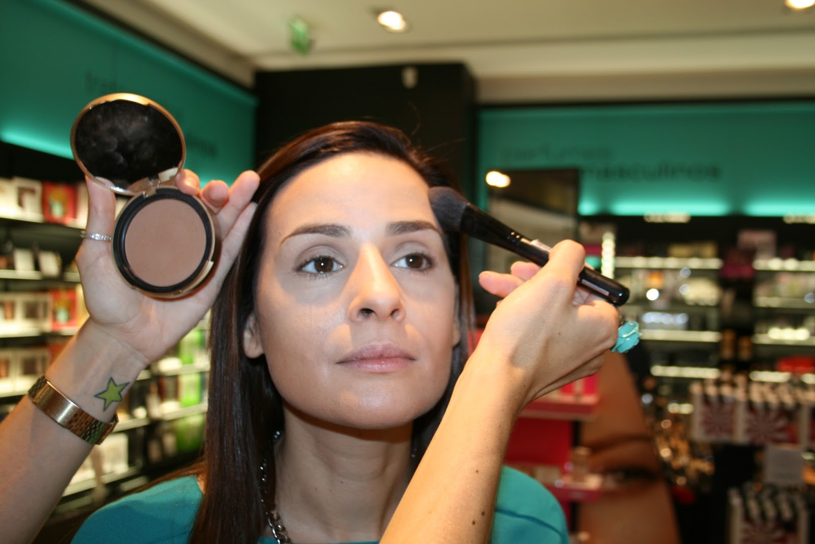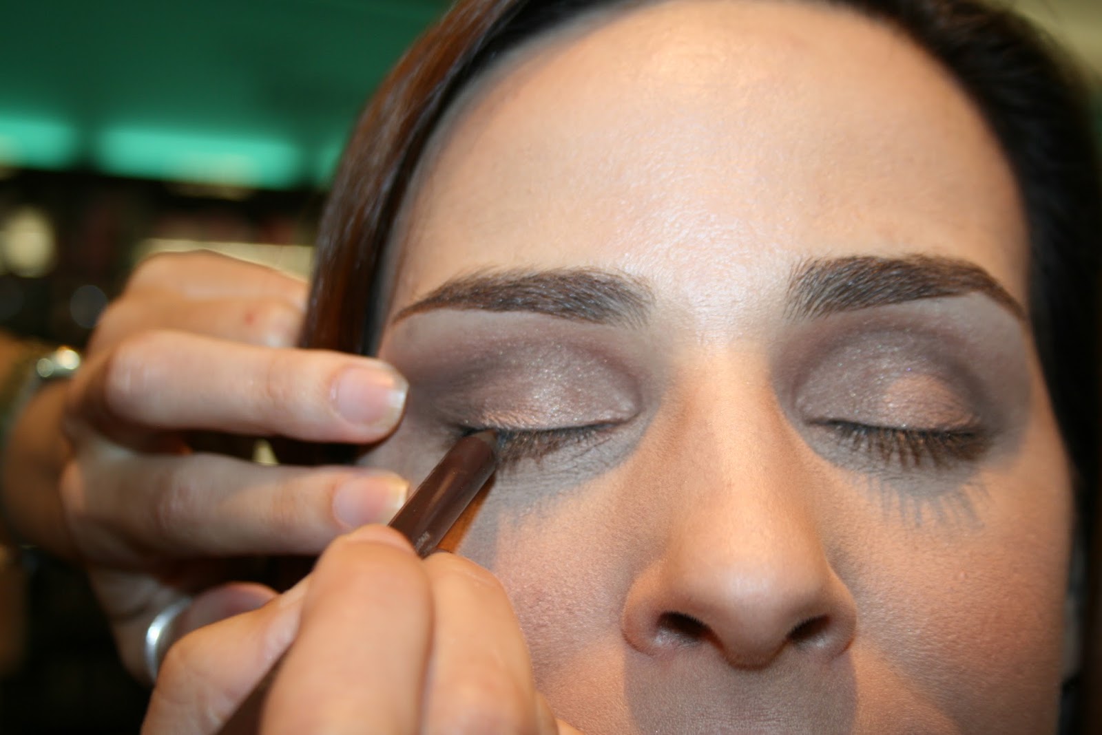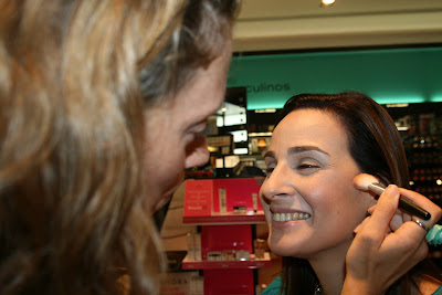 Depois, a Sónia aplicou um tom acastanhado shimmer nos cantos exteriores do olho, junto às pestanas, em cima e em baixo, fazendo o contorno do côncavo do olho e esbatendo para o interior do rosto.